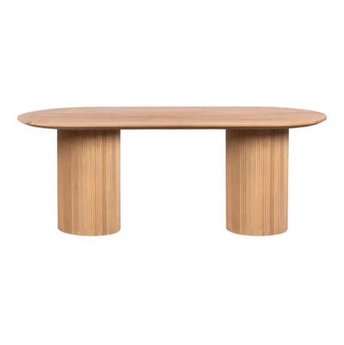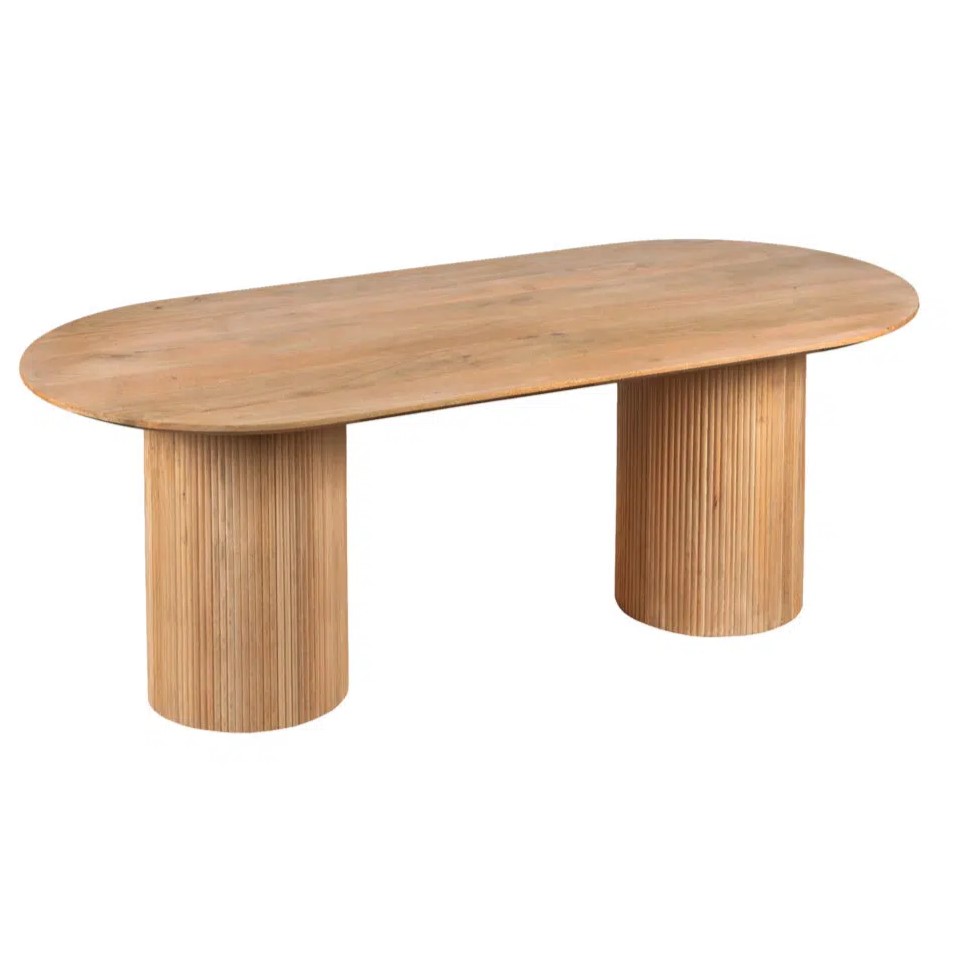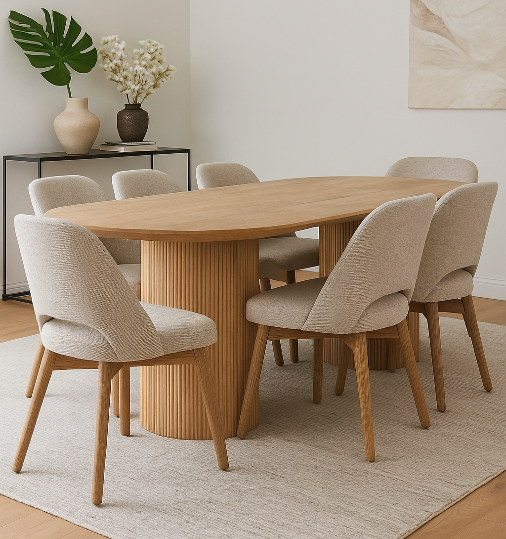 Elevate your dining space with this handcrafted oval dining table, featuring a smooth natural wood finish and distinctive fluted cylindrical legs. Its organic curves and minimalist design bring a warm, contemporary elegance to any interior. Perfect for hosting gatherings or daily meals in style.
