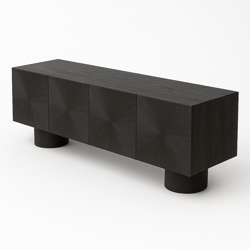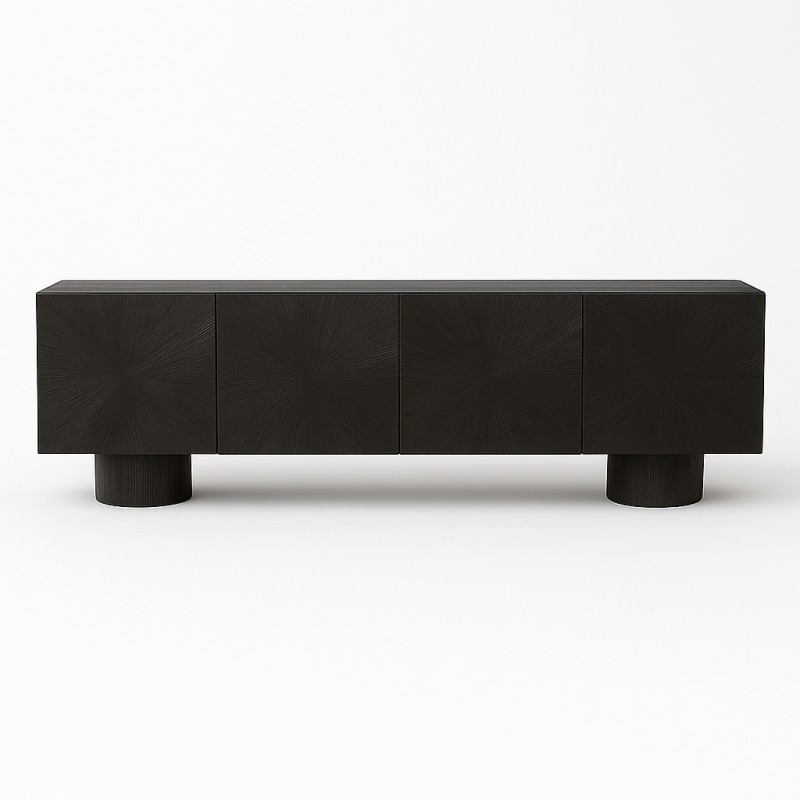 Crafted from solid mango wood with a striking sandblasted black finish, this TV cabinet features a captivating sunburst pattern on doors. The bold cylindrical legs add sculptural charm, while the spacious interior offers ample storage for media essentials. A perfect blend of modern design and artisanal texture.