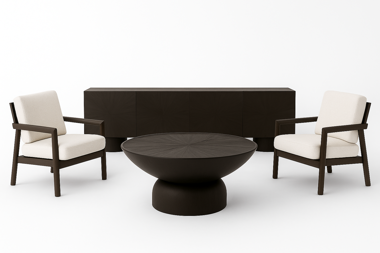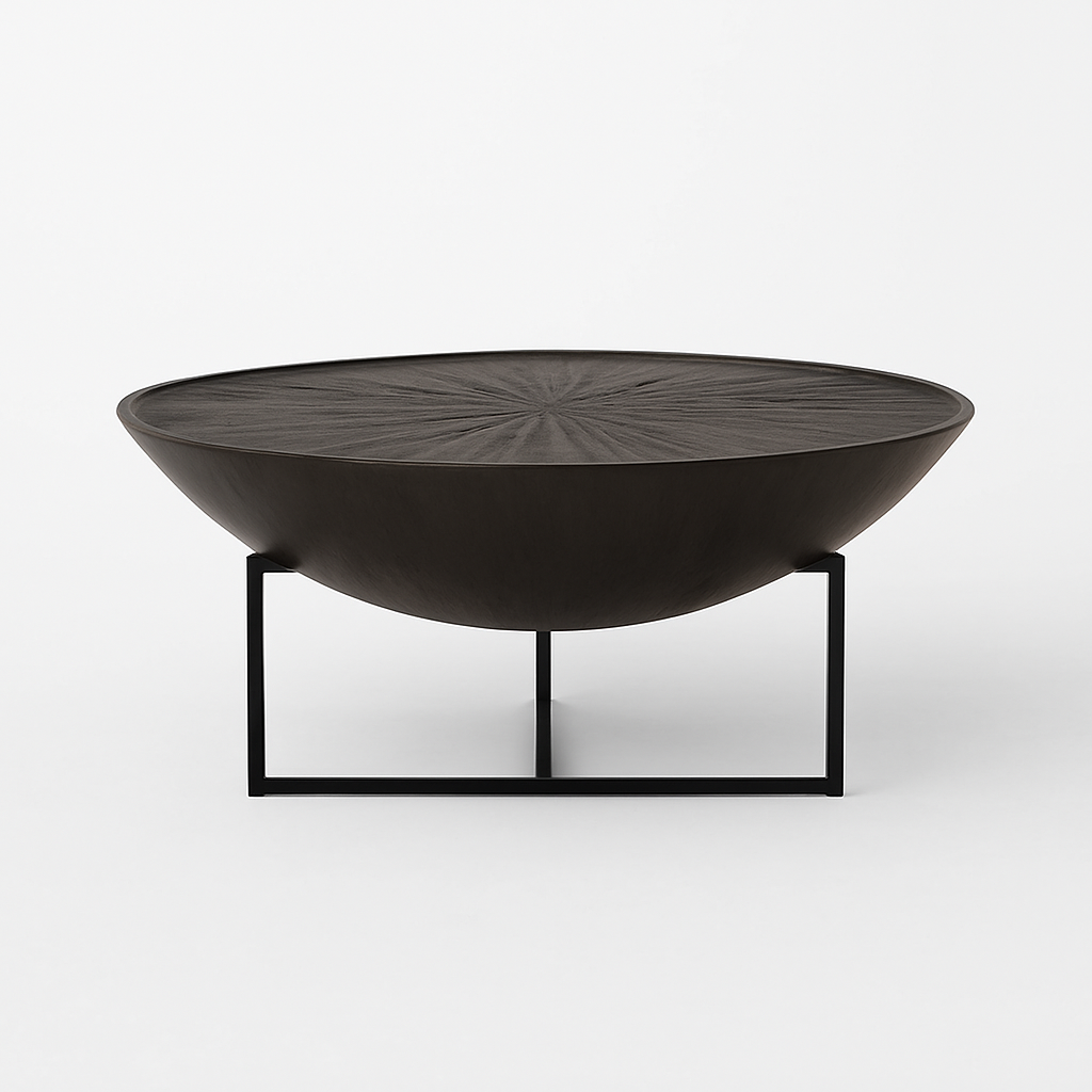 A bold fusion of form and texture, this sculptural coffee table features a deep, bowl-shaped top resting on a rounded base. Finished in rich dark wood, it brings a contemporary, art-inspired presence to any modern living space.