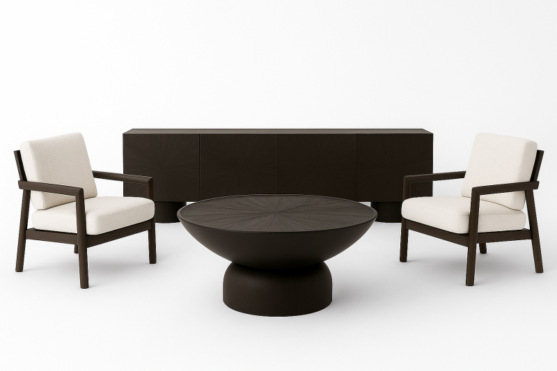 Crafted from solid mango wood with a striking sandblasted black finish, this TV cabinet features a captivating sunburst pattern on doors. The bold cylindrical legs add sculptural charm, while the spacious interior offers ample storage for media essentials. A perfect blend of modern design and artisanal texture.