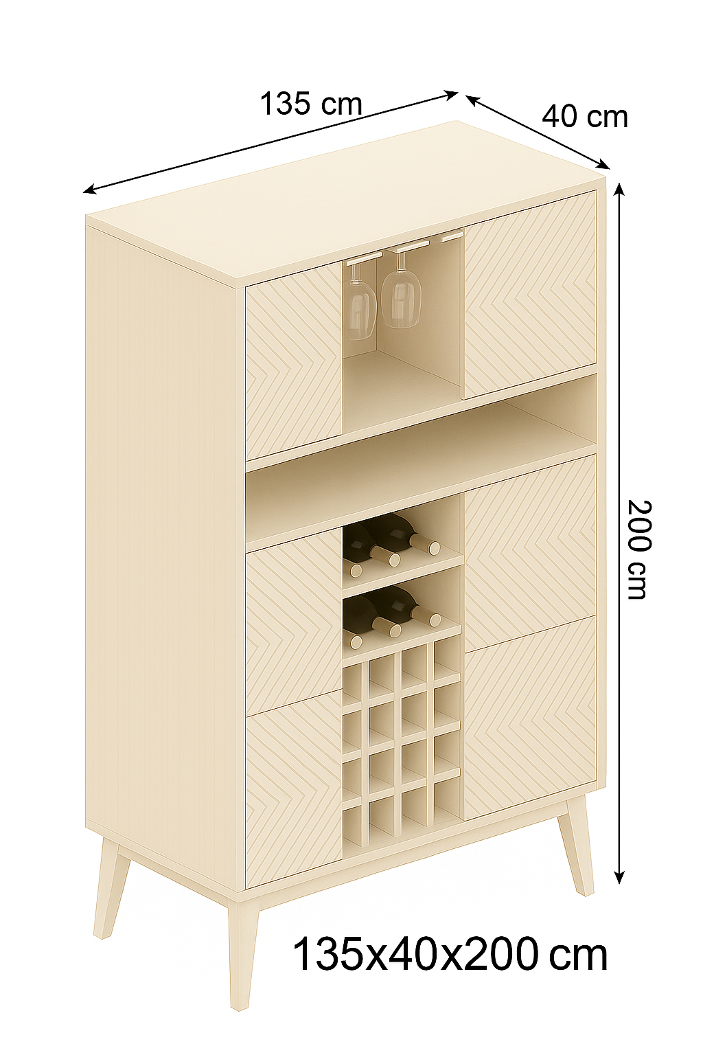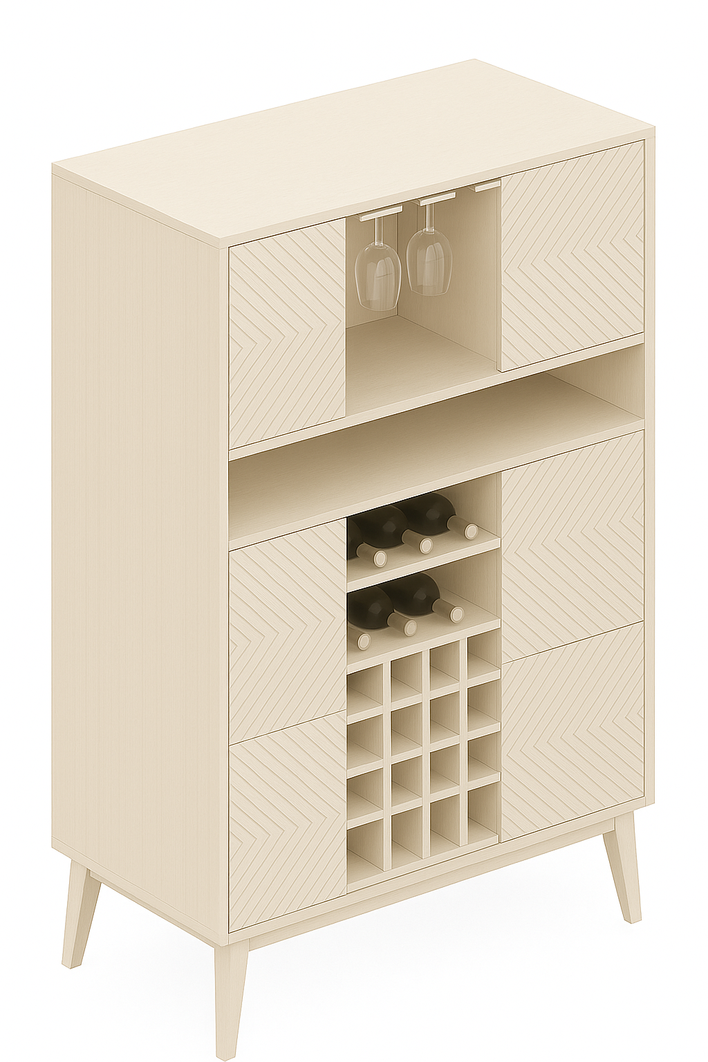 Elevate your hosting experience with this elegant handcrafted wine cabinet. Designed in a soft natural wood tone, it features intricate chevron-patterned doors, dedicated wine glass holders, spacious shelving, and a 18-slot wine rack. A perfect fusion of functionality and style, this piece adds modern sophistication to any living or dining space while keeping your favorite vintages beautifully organized and within reach.